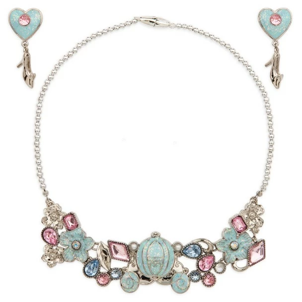 Lend a magic touch to any Cinderella ballgown with this breathtaking jewelry set designed to complement our costume collection. A silvery necklace with pumpkin coach and floral filigree, plus glittering faceted gems, is matched by heart earrings with shining slipper bobs.