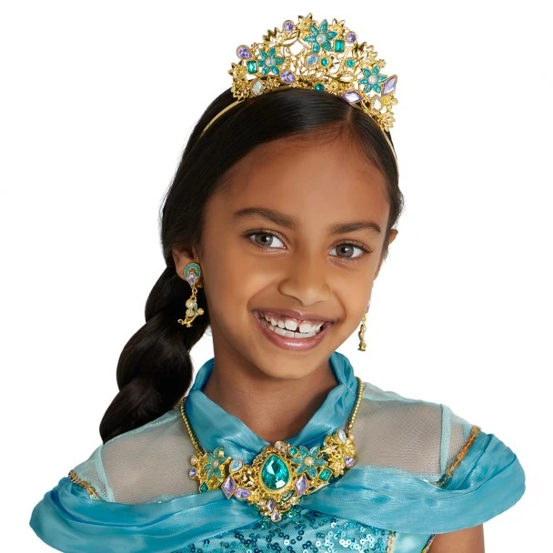 Grant an extra wish to any Jasmine outfit with this breathtaking jewelry set designed to complement our costume collection. A golden necklace with floral filigree, faceted gems, and faux pearls, is matched by earrings with magic lamp bobs.