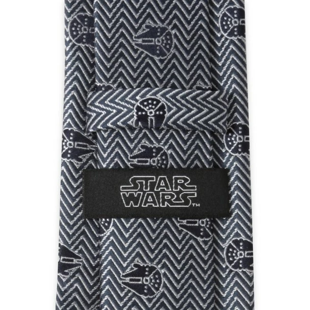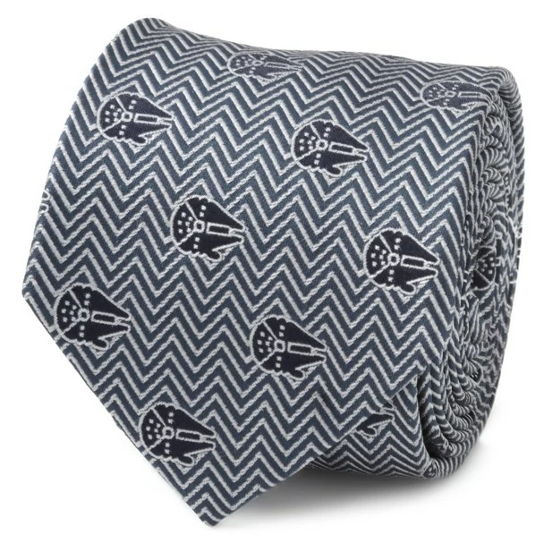 ”Fly casual,” but dress formal with this stylish black and grey herringbone tie featuring the fastest hunk of junk in the galaxy. Made with 100% silk, this Millennium Falcon tie is a must for Star Wars fans.