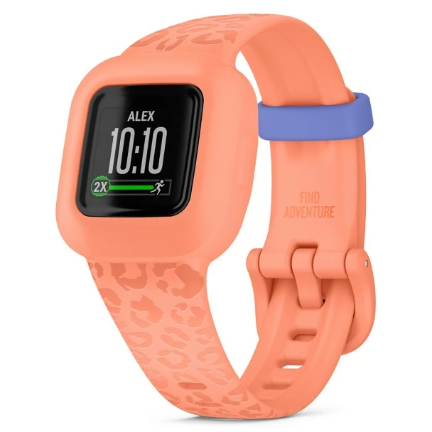Featuring a colorful display and Peach Leopard print design, this kid-tough, swim-friendly vívofit jr. 3 fitness tracker can uncover educational, globe-trotting app adventures and mini games on the parent-controlled smartphone app by completing 60 minutes of daily activity.
