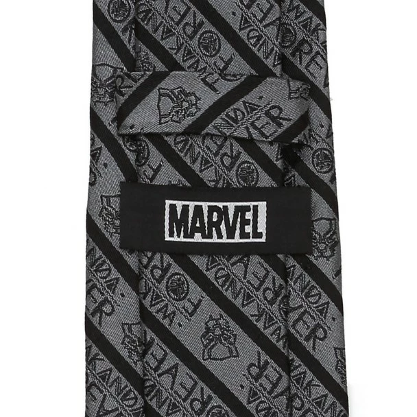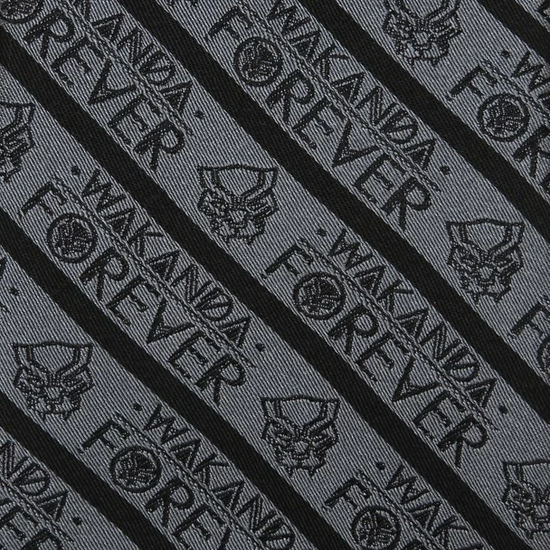 A dusky gray forms the background for this silk tie that features the logo of the Black Panther throughout its diagonal stripes. Stylized letters stamp out the words ”Wakanda Forever” in neat rows, ensuring this tie becomes part of your favorite formal look.